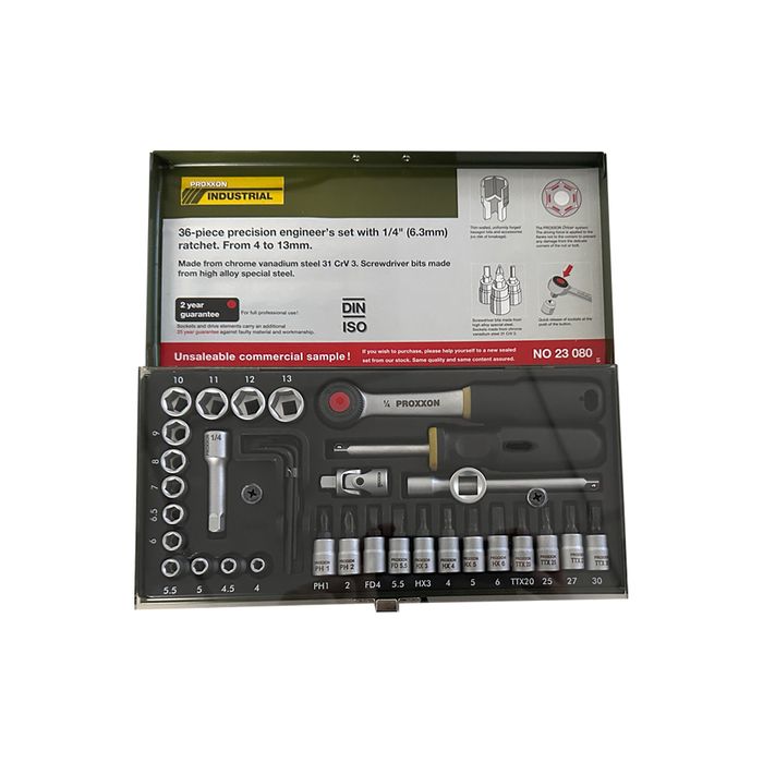 PROXXON SHOP DISPLAY Version of Art. 23080 - 36 Piece 1/4" Socket Set (see RELATED PRODUCTS). This demonstrator set acts as a great visual incentive by showing potential customers all the items that come in the regular set.