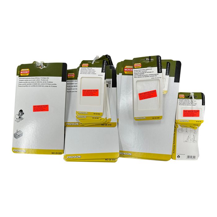 Set of PROXXON Out of Stock Hang Cards for ALL Micromot products. Each card is designed to hang in place of it's designated product as a notification to prospective customers that the item is currently out of stock.