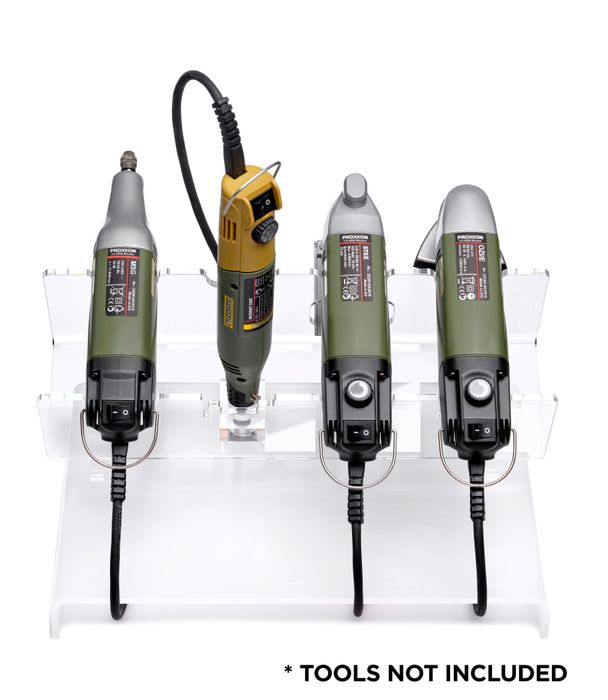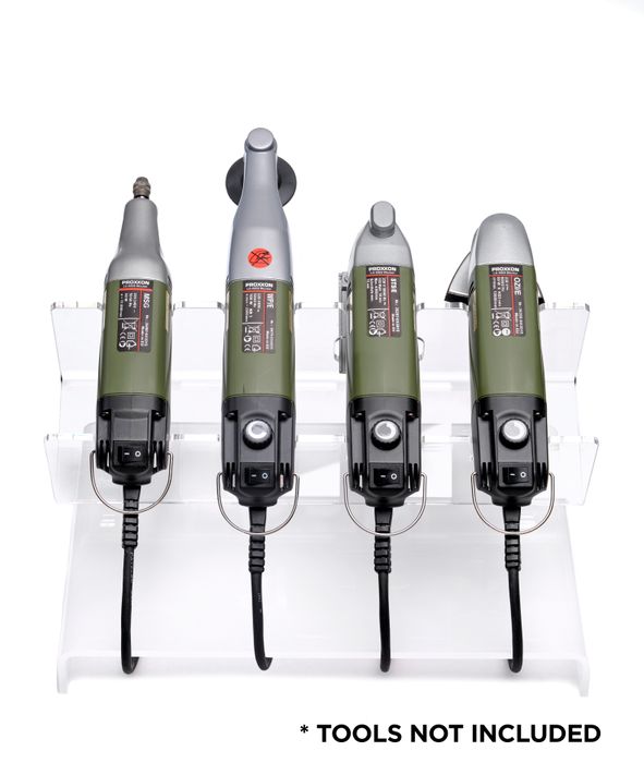 PROXXON Micromot Angled Shelf Display Unit. This compact and durable display unit lets you display four Micromot Corded Handheld Power Tools and is a great way to show off your most popular items from that product range.