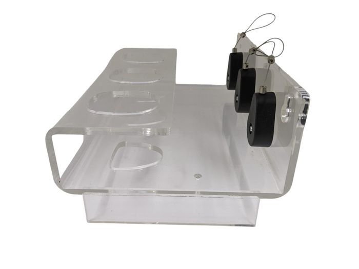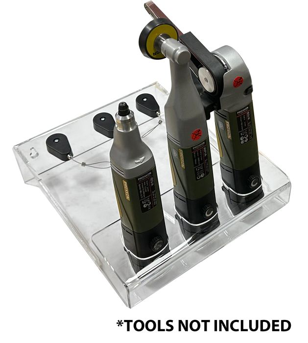 Display unit comes fitted with 3 x Steel Wire Security Tethers and 3 x PROXXON Battery Covers to secure the cables to as an anti-theft measure. Unit also comes with 2 x Fixing Screws for wall mounting, 2 x Allen keys for adjusting the Security Tethers and a set of Micromot product stickers that can be fixed to the front end of the stand.