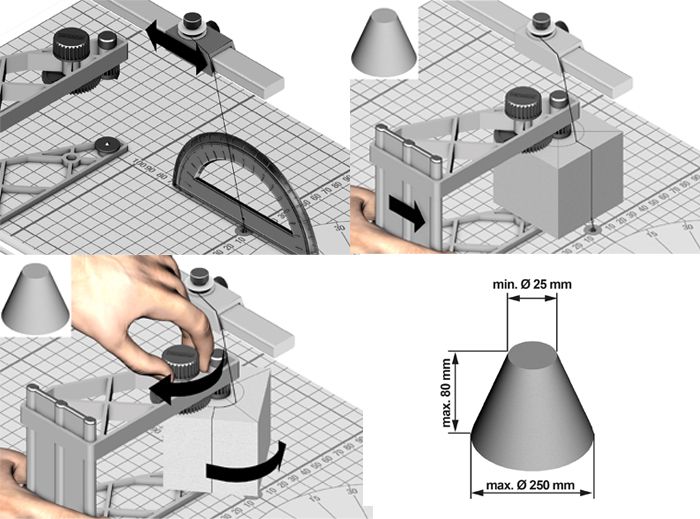 Solid construction made of aluminium (anodised). Stepless, tool-free height adjustment. Generous feed gear ratio (1:3) for comfortable cutting without having to reach round the rotary knob. Simple preselection of the desired workpiece diameter by moving the device in the table groove. Ergonomic handle for a secure grip during operation.