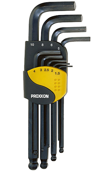 9 Piece PROXXON Metric Allen Key Set. Made from Chrome Vanadium Steel, long end comes with a spherical finish whilst the short end is chamfered to suit different Allen Screw types. Set comes in foldable plastic holder.
