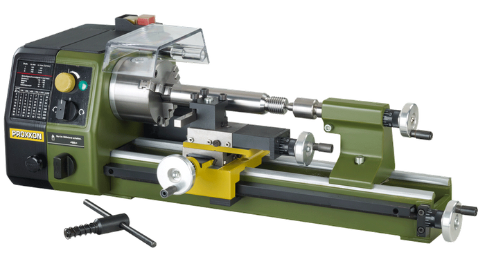 Support: Bed carriage made of die-cast zinc. Cross slide and top slide of steel (adjustment 60 or 45mm). Turning tool post for cutting tools size 8 x 8mm.