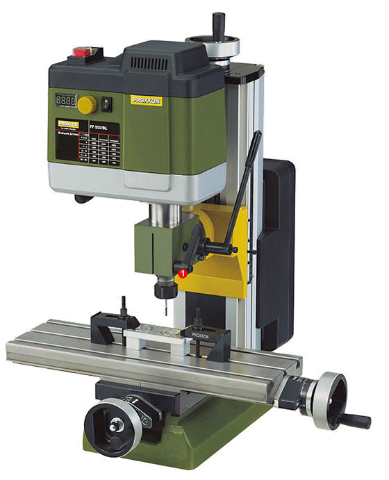 Height adjustment of milling head via hand wheel.
