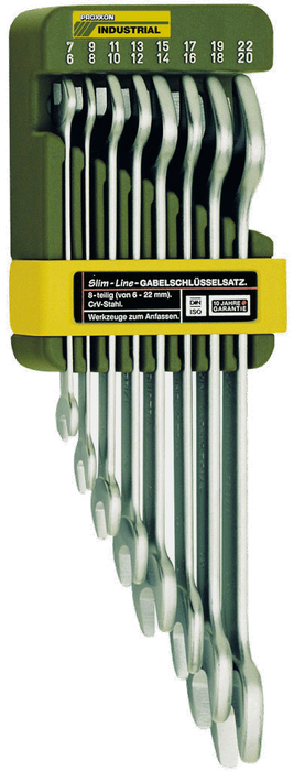Includes 6 x 7, 8 x 9, 10 x 11, 12 x 13, 14 x 15, 16 x 17, 18 x 19 and 20 x 22mm. Supplied with a plastic holder with slot for each spanner and holes for attaching to a wall. All spanners are clearly labelled to make them easy to find and organise.